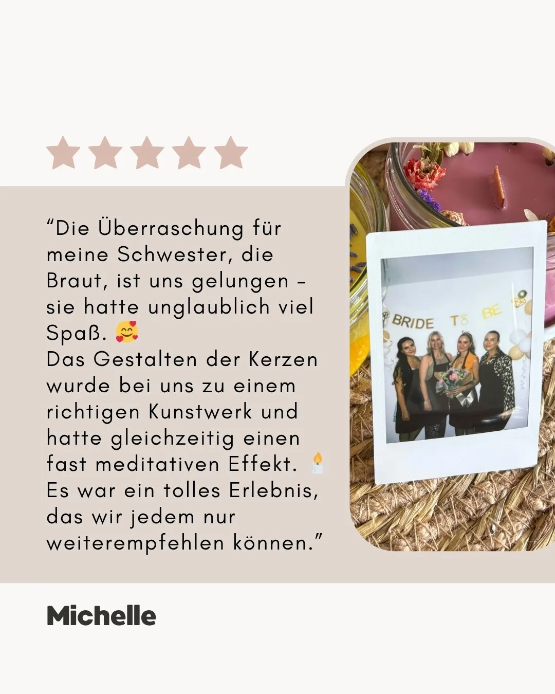 Bei unseren Candle Crew JGA Workshops entstehen ganz besondere JGA Erlebnisse: gemeinsam kreativ werden, lachen, glitzern und zwei wunderschöne Duftkerzen gießen, die euch noch lange an den Tag erinnern.